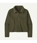 Shortened chore coat silhouette with a full-length zipper and a turndown collar to keep your neck warm