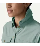 Double-layer collar converts to a stand-up collar for additional sun protection, and hidden snaps at the collar points eliminate flapping in the wind